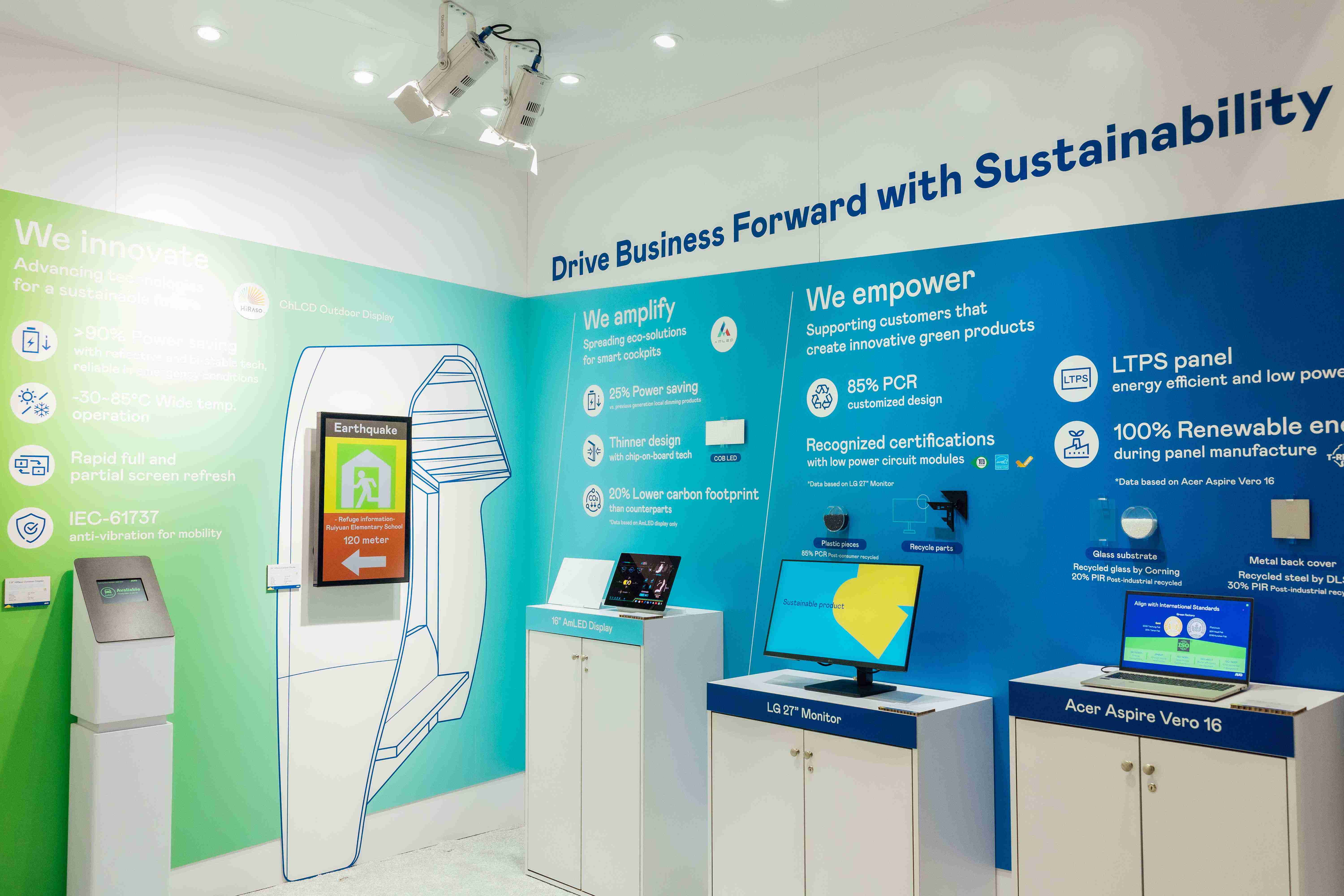 人生就是博运用创新显示技术HiRaso胆固醇液晶双稳态技术达到显示零耗能、、、扩大节能省电的AmLED显示技术应用于车用产品、、以再生的消费后回收(PCR)塑料及全绿电生产之面板,,应用于笔电及萤幕,,增加绿色价值。。