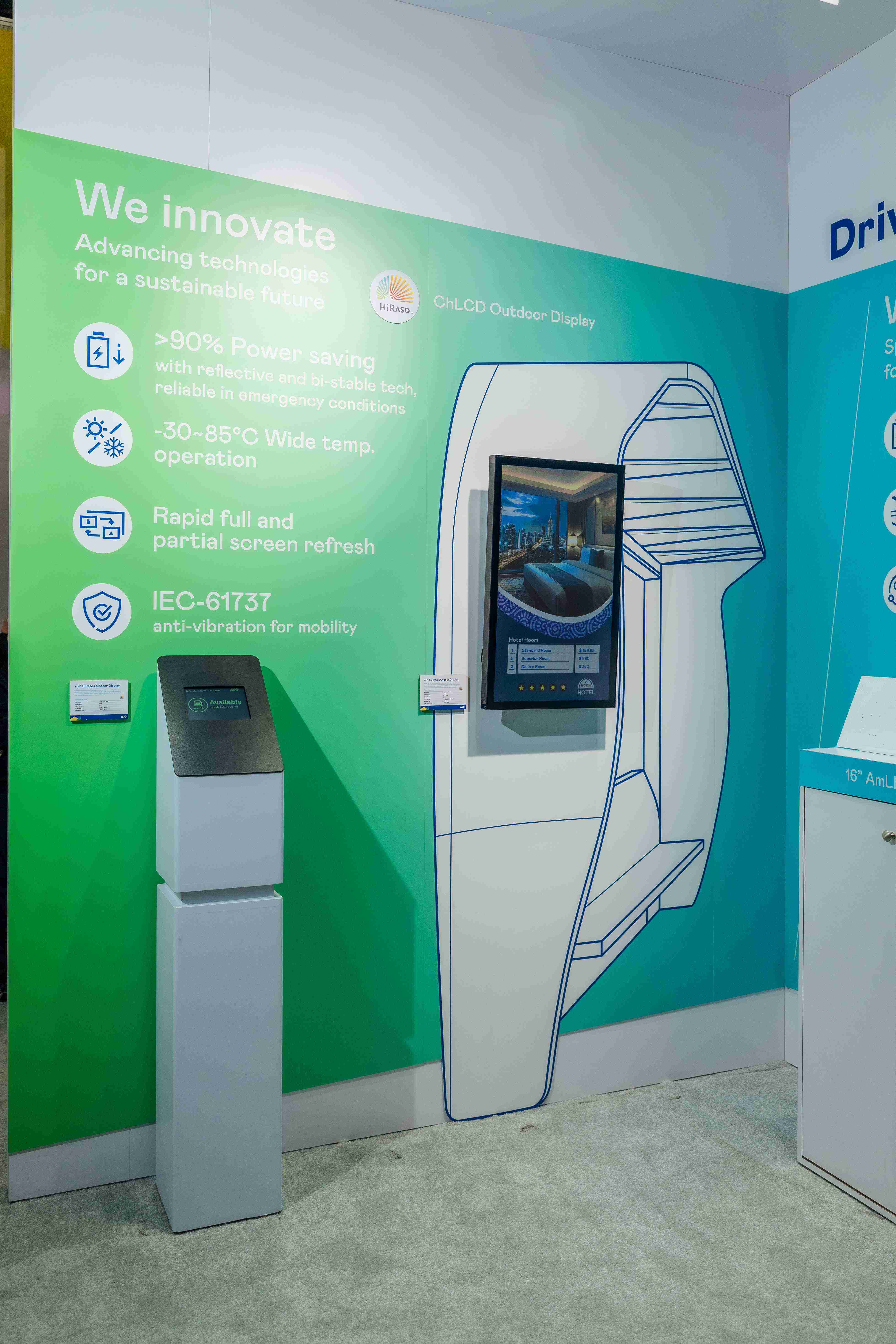 HiRaso胆固醇液晶显示器运用反射环境光线的方式,,,呈现影像显示时零耗能的环保省电诉求,,,光线愈强愈能呈现绝佳的色彩饱和度及显示效果,,同时在摄氏-30度至85度间宽温的使用优势,,,,为户外电子看板的新首选。。