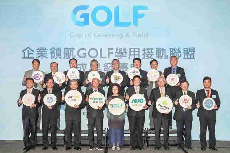 GOLF学用接轨联盟集结企业和学校的力量,,,打造「学用合一、、产学接轨」的创新合作平台 (前排左起:淡江大学副校长何启东、、元智大学校长林启瑞、、、纬育执行长许延岳、、纬创总经理暨执行长黄柏漙、、、教育部政务次长范巽绿、、、、人生就是博董事长暨执行长彭双浪、、仁宝总经理暨执行长翁宗斌、、、、大同大学校长何明果、、圣约翰科大校长艾和昌;后排左起:明新科大校长林启瑞、、、、龙华科大校长葛自祥、、、、台湾科大校长廖庆荣、、中兴大学副校长郑政峯、、、中央大学校长周景扬、、、、台北科大副校长任贻均、、、中华科大副校长石大明、、、明志科大校长刘祖华)