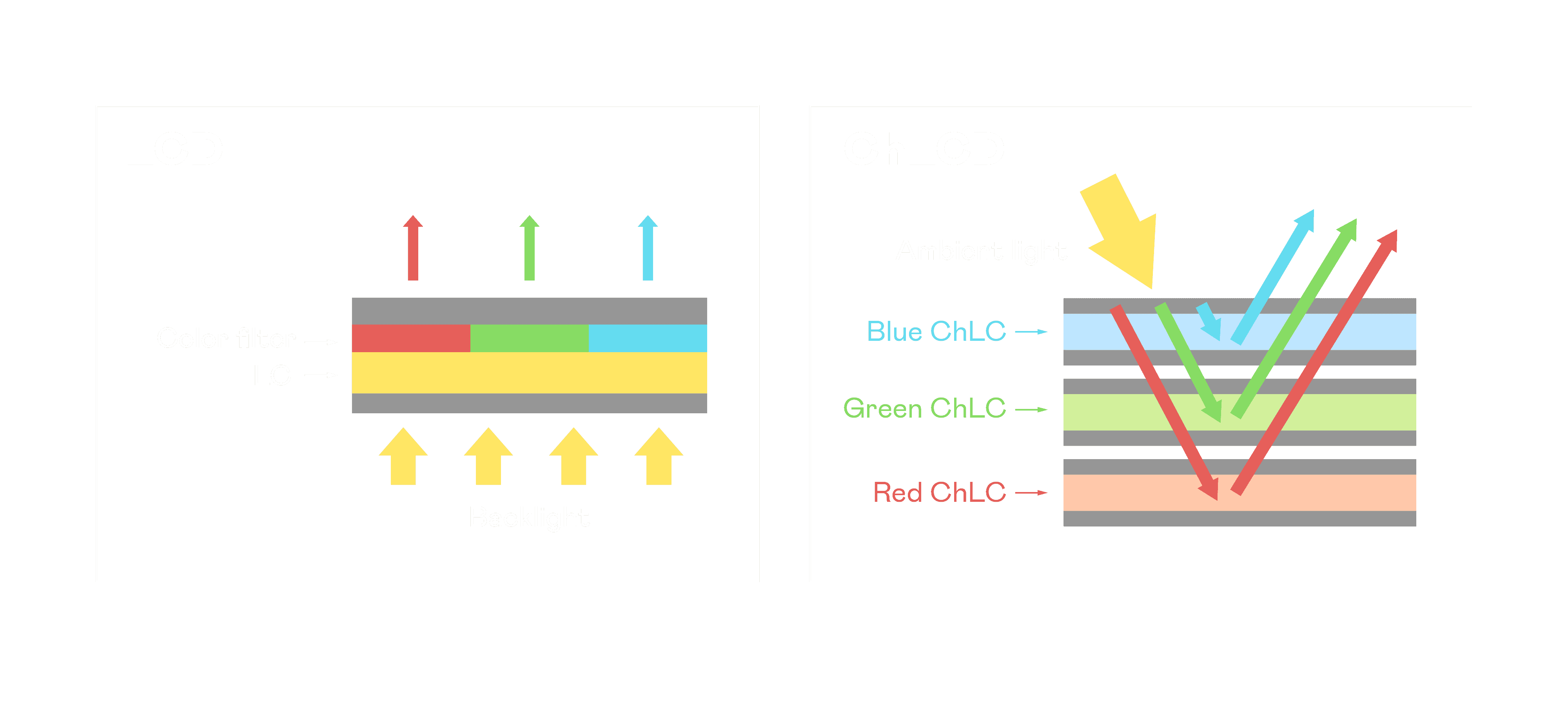 ChLCD 胆固醇液晶就如同纸张一样,,,透过反射环境光来显示影像,,,,因此长时间观看不易造成人眼视觉疲劳,,可达到护眼效果。。。。当处于户外阳光下使用,,,LCD 影像容易失真而不易观看,,但胆固醇液晶仍可维持较佳的影像品质。。。。